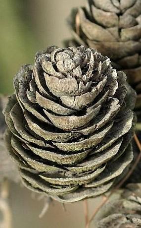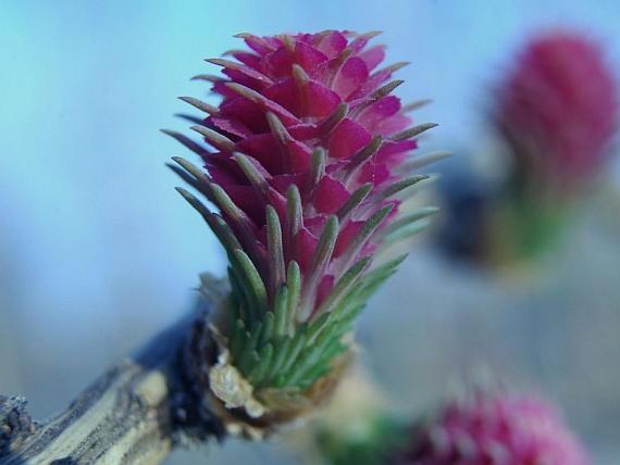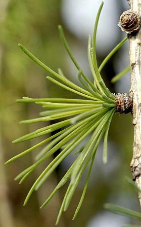 Strom dorůstající výšky 20-50 m. Kmen je přímý s hrubou na povrchu šedavě zbarvenou borkou. Koruna kuželovitá, jehlice na brachyblastech ve svazečcích nejčastěji po 30-50, světle zelené.
