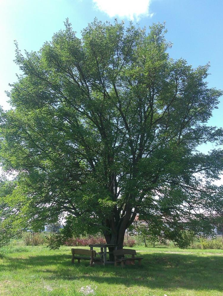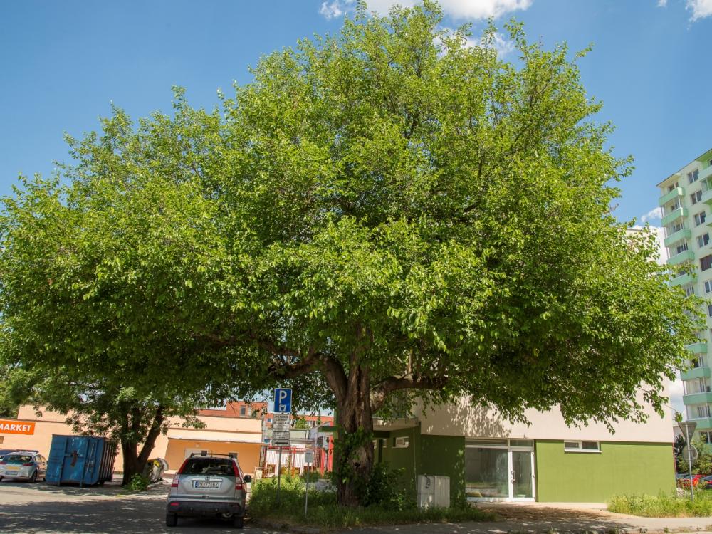 Strom až 17 m vysoký, v méně příznivých podmínkách spíše keř s širokou korunou. Borka je šedohnědá. Listy jsou řapíkaté, řapík je tenký, obvykle delší než 1/5 čepele, která je často široce eliptická, ale tvar listů je velmi variabilní. Plodenství je 1–2 cm dlouhé, válcovité až kulovité, složené z mnoha zřetelných plůdků. Stopky plodenství zdéli bílých až fialově červených plodenství.