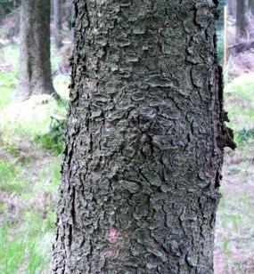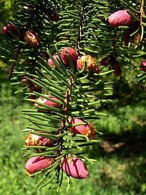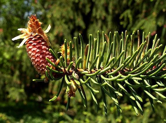 Strom vysoký až 50 m s kuželovitou korunou, v horských oblastech a rozvolněných porostech zavětvenou často až k zemi. Větve jsou mírně vztyčené nebo mírně ohnuté k zemi (u starších stromů), jen ve vrcholových partiích vždy mírně vztyčené, větvičky převislé. Jehlice tmavě zelené, až 2 cm dlouhé.