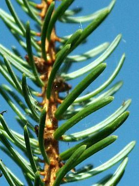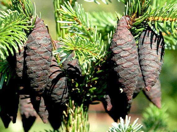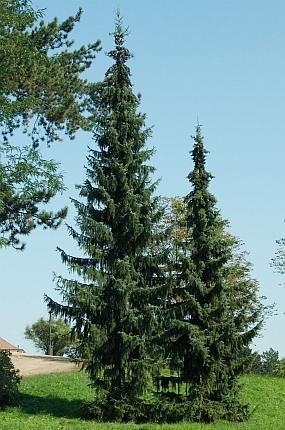 Strom o výšce až 30 m, má úzkou sloupovitou korunu. Větve krátké, dolní skloněné, pupeny červenohnědé bez pryskyřice.