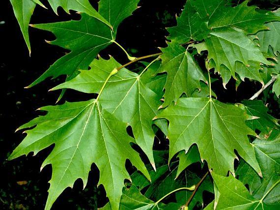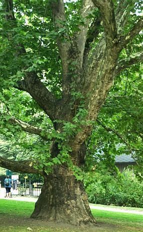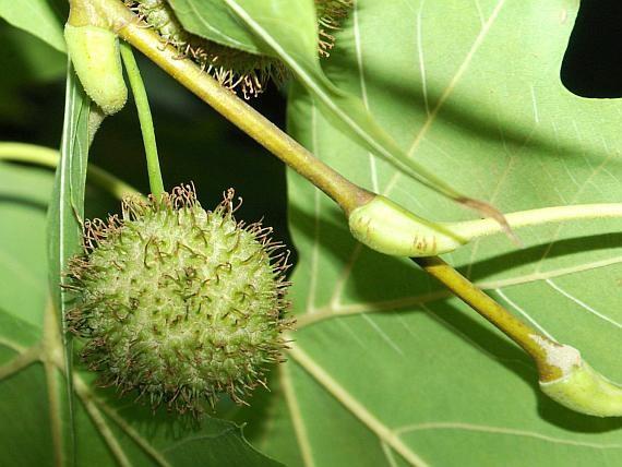 Opadavý strom dorůstající výšky až okolo 40 m, se širokou korunou a silným kmenem. Borka starších stromů je složená z několika vrstev o různé barvě, postupně se odlupuje, čímž kmen získává velmi charakteristický vzhled. Listy jsou řapíkaté, listová čepel je (3-)5(-7) klaná, zhruba do poloviny členěná, 15-28 cm dlouhá a 17-28 cm široká.
