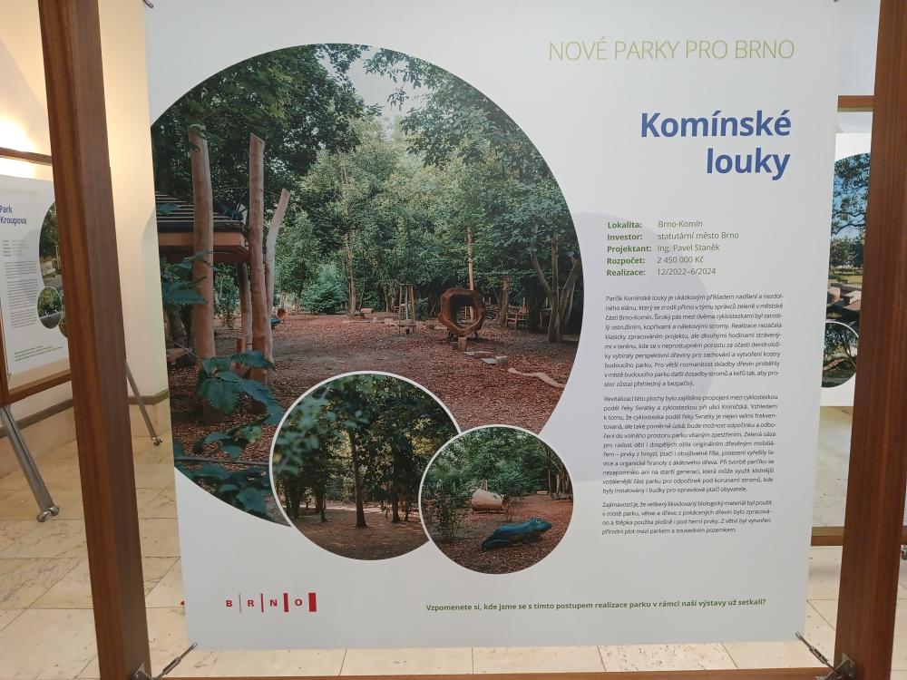 Parčík na Komínských loukách byl otevřen v červnu 2024 po 1,5 roční realizaci. Původní neprůchozí porost tvořený převážně javorem jasanolistým a ořešákem královským byl vyčištěn od odpadků, ostružiníku. Z původních dřevin byly vybrány a ponechány desítky perspektivních dřevin, které byly arboristicky ošetřeny, zbytek byl vykácen. Do přírodního parčíku byl doplněn dřevěny mobiliář, relaxační plochy a cvičební prvky. Součástí parčíku je i soustava balančních prvků a dřevořezby zvířat. Na plochu téměř 4 000 m2 bylo dosazeno 18 stromů a 86 keřů. Parčík má sloužit nejenom lidem, ale i nejrůznějším živočichům, kvůli kterým bylo do výsadeb zahrnuto množství dřevin domácích, popřípadě zdomácnělých druhů, které budou atraktivní pro široké spektrum hmyzu, ptáky a drobné savce. Část původního bylinného patra byla taktéž zachována, dosety byly nejrůznější trávy a byliny, které budou v určitých částech pravidelně sekány, v jiných budou ponechány téměř bez údržby. Parčík je určený pouze pro pěší, je zde zakázaný volný pohyb psů a zejména vjezd cyklistům.