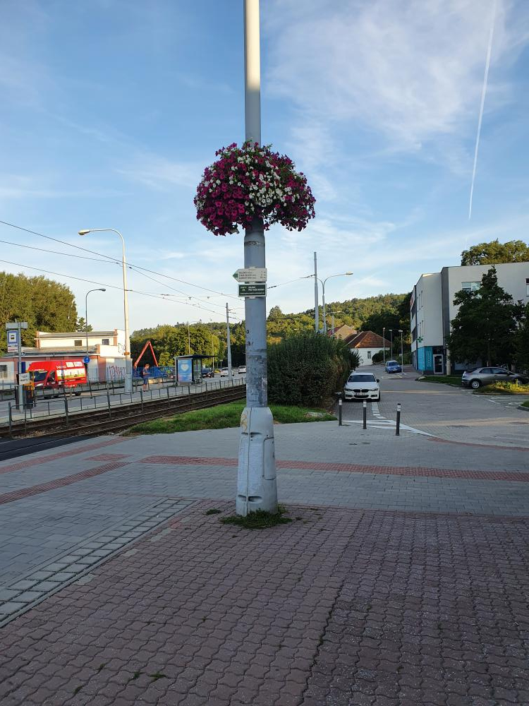 V letošním roce bylo na sloupy v MČ Brno-Komín umístěno 16 květinových výsadeb letniček.